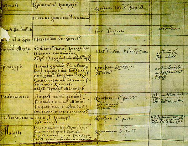 忠誠被受質疑的精英以及反對改革的貴族在1722年的聲浪達到顛峰,也就是官秩表實行的該年,一份正式的階級清單被用到俄羅斯的軍事、政府以及皇家法院,職級表混合許多頭銜與尊稱的系統而建立,每個階級都下分很多等級(I到XIV),以表示對沙皇的忠誠度的特殊等級,職級表主要用在軍隊組織,這也象徵了彼得統治時期的現代化與革新。