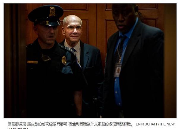國務卿邁克·龐皮歐的前高級顧問麥可·麥金利因職業外交服務的處理問題辭職。 ERIN SCHAFF/THE NEW YORK TIMES