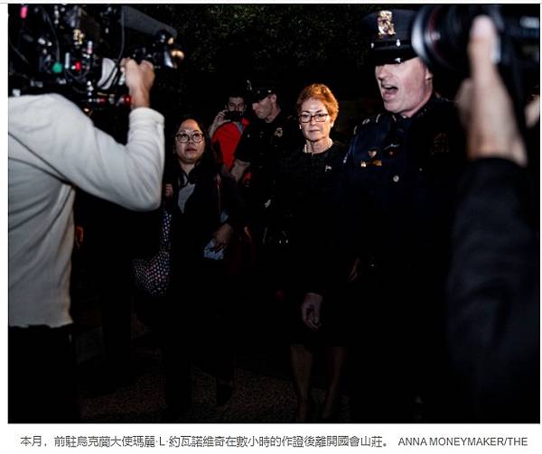 本月,前駐烏克蘭大使瑪麗·L·約瓦諾維奇在數小時的作證後離開國會山莊。