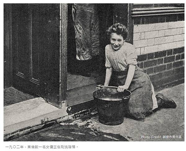 一九○二年,東倫敦一名女傭正在刷洗階梯。