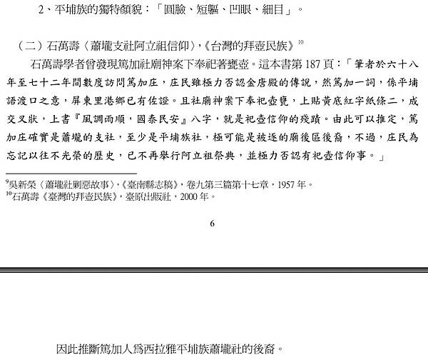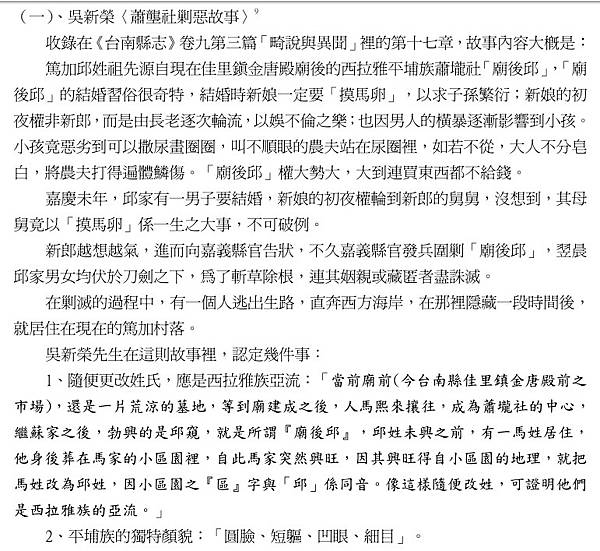一、 隨便更改姓氏,應是西拉雅族亞流:「當前廟前(今台南縣佳里鎮金唐殿前之市場),還是一片荒涼的墓地,等到廟建成之後,人馬熙來攘往,成為蕭?社的中心,繼蘇家之後,勃興的是邱窺,就是所謂『廟後邱』,邱姓未興之前,有一馬姓居住,他身後葬在馬家的小區園裡,自此馬家突然興旺,因其興旺得自小區園的地理,就把馬姓改為邱姓,因小區園之『區』字與「邱」係同音。像這樣隨便改姓,可證明他們是西拉雅族的亞流。」(節錄<蕭壟社剿惡故事>)