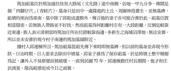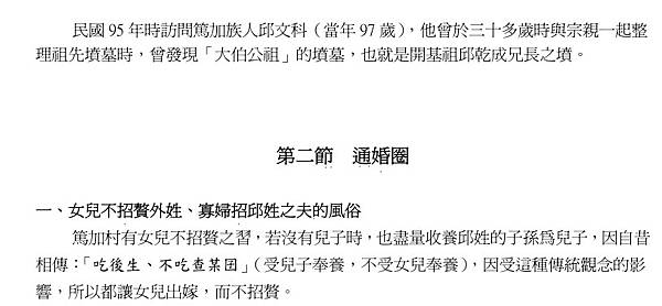 「我們訪問一位七十二歲的邱逢老人,據說他是此地的古式智識者,最知本庄的典故,他拿日據時期他們的族人邱狗所編的族譜給我們看。他們的祖籍如前記,……。假使他們不是漢人,我們可以想像至乾隆時代,他們一族始得漢姓,而成一大家族,始到唐山認祖,乃得唐山的祖籍及族譜。不論如何,他們的開基祖為邱乾成,生五子為五房,……乾成前曾娶一洲仔尾媽,未生子而亡,可見他當時與洲仔尾有往來,亦可想像他不但是個漁人,也是個航海人。」