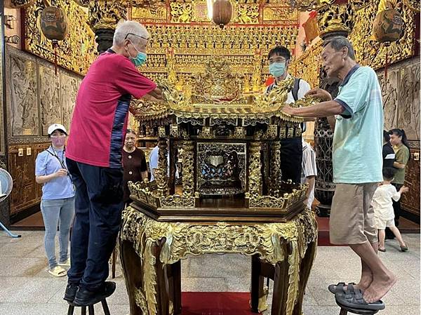 台南開基臨水夫人媽廟近期完成了教母亭的修復工程,罕見的全木雕、組裝式教母亭非常典雅貴氣,由著名木雕藝師劉進文負責修復。該亭高達近3公尺,重量超過百公斤,已有40年歷史。在金價飆升的背景下,修復過程中重新安金使用了超過1兩2重的黃金金箔,市價逾12萬元,將本周六做16歲儀式中正式亮相。
