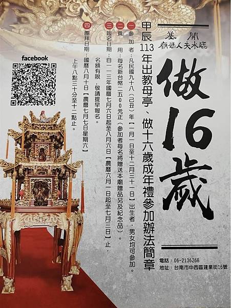 「做16歲」是著名的台式成年禮,一般常見是拜七娘媽,但也會拜其他神明,如同樣是婦女孩童守護神的臨水夫人。