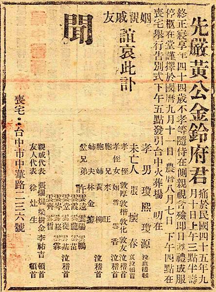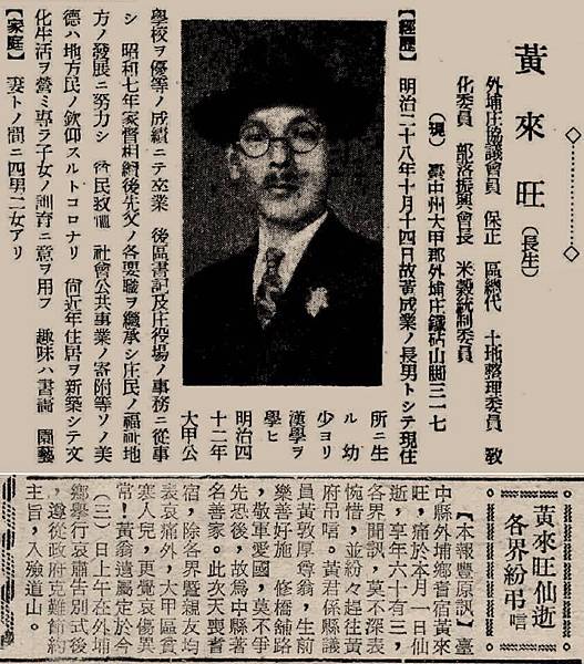 黃除擔任眾多公職,也是當地的大善人,對社會公益亦盡力投入,深受鄉親愛戴,黃來旺於1957年逝世時,報載他生前「樂善好施,造橋鋪路、敬軍愛國……除各界暨親友均表哀痛外,大甲區貧寒人兒,更覺哀傷異常!」(下圖)可見大甲、外埔生活圈之趨近,黃來旺亦曾擔任過大甲鎮瀾宮的副管理人一職。1955年,黃也以耆宿之高聲望,協助長子黃敦厚當選台中縣議員,為民喉舌,一門三代皆為地方上的要角。