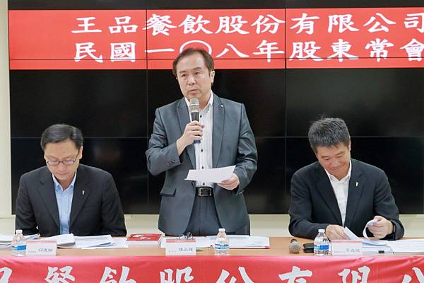 王品(2727)今日召開股東會,小股東說過去王品集團只認識戴勝益,王品董事長陳正輝(中)表示,王品要永續經營,不可能只等同於任何1個人,企業必須要靠法制精神與公司治理,「我絕對不會讓王品等於陳正輝。」(圖由王品提供)