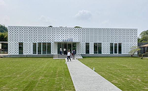 美術館設計上,利用景觀來營造環境氛圍,以白色圓點帷幕包覆水泥架構,矗立在林裡間更顯得清新靜謐。記者宋健生/攝影