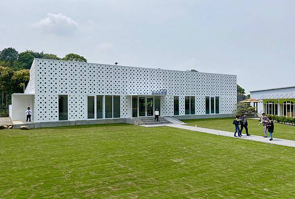 美術館設計上,利用景觀來營造環境氛圍,以白色圓點帷幕包覆水泥架構,矗立在林裡間更顯得清新靜謐。