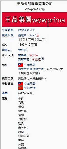 王品餐飲股份有限公司(Wowprime corp,英文縮寫Wowprime,簡稱王品集團),是一家臺灣的連鎖餐飲事業集團企業,目前旗下共有420間品牌餐廳。