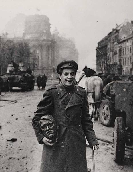蘇聯詩人多瑪托夫斯基(Jewgeni Dolmatowski)手上拿著雕像割下來的希特勒首級,在滿目瘡痍的德國國會大廈前開心散步。這張紅軍攻下柏林後拍的著名照片,目前正在德國歷史博物館紀念終戰七十週年的特展展出。(攝影/Yevgeny Khaldei;版權/德國歷史博物館Ernst Volland與Heinz Krimmer收藏;林育立提供)