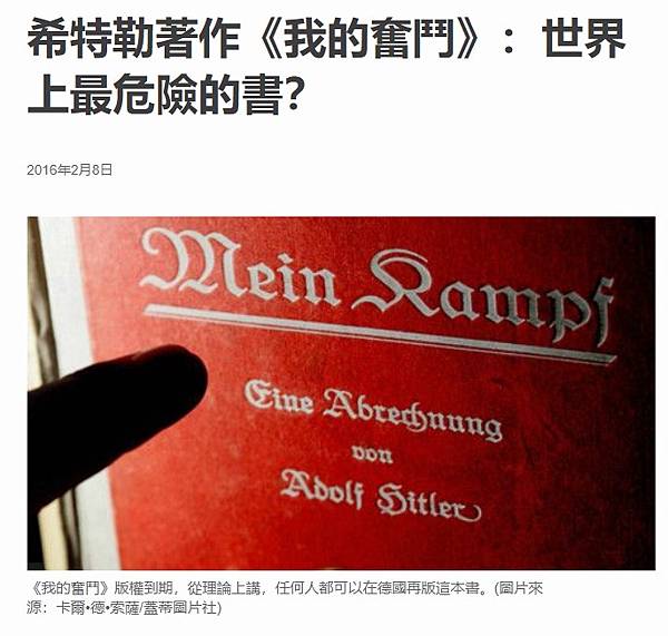 幸好,這個在第二次世界大戰結束後,維持了70年的出版禁令,半個月後就即將失效:2016年1 月,德國將可再度出版希特勒最重要的著作:《我的奮鬥》(Mein Kampf)。