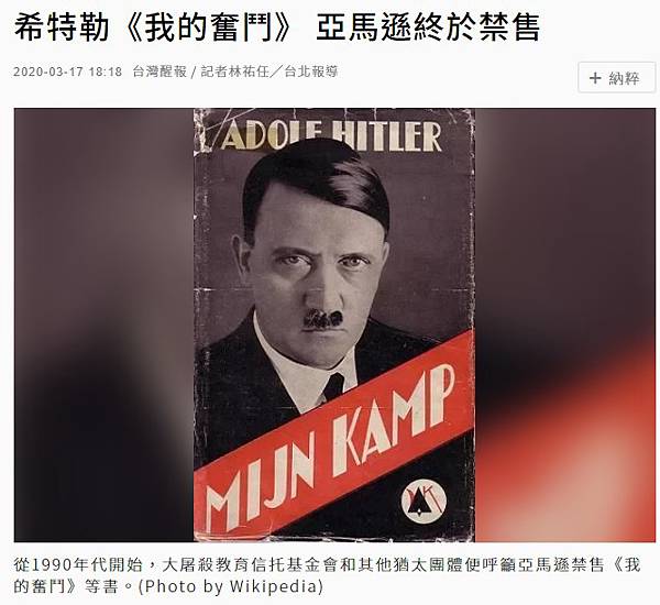 希特勒的自傳《我的奮鬥》20多年來被猶太人團體視為眼中釘,終於在16日被亞馬遜禁售!雖然《我的奮鬥》在許多國家遭到管制,但在英國和印度卻成為暢銷書。過去亞馬遜一向以「捍衛言論自由」和「讓學生理解希特勒思想」為由拒絕禁售此書,對於16日突然禁售的決定,亞馬遜則不願解釋理由。