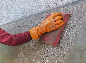 表面處理過後,用抹刀以0.5~1公分的厚度塗抹於施作的牆面或地面,抹平之後待七分乾時,用海綿擦拭,將表面水泥擦去,至石子能清晰露出,等石子及水泥完全乾燥後,再用清水全面抿洗過一次,務求表面不留水泥痕跡。