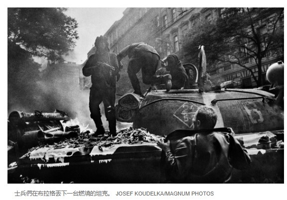 士兵們在布拉格丟下一台燃燒的坦克。 JOSEF KOUDELKA/MAGNUM PHOTOS