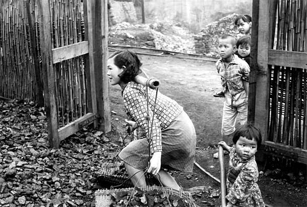 民國49年,基隆一名母親礦工家庭的婦女,用扁擔裝煤塊,背運到他處,年幼的女兒幫著媽媽鏟煤,童稚的臉龐沾上烏黑的煤渣。(取自徐宗懋圖文館製作「歲月台灣」)