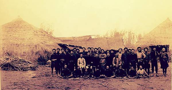 圖1.日治初期糖廍工作人員合影,漢人及平埔族人共約40人,屬大型糖廍。左右尖頂建物為廍亭,中間平頂為廍厝。(照片:林麗鳳提供)