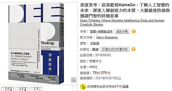 博客來-深度思考:從深藍到AlphaGo,了解人工智慧的未來、探索人類創造力的本質,大腦最後防線與機器鬥智的終極故事 https://bit.ly/38rYv6Q