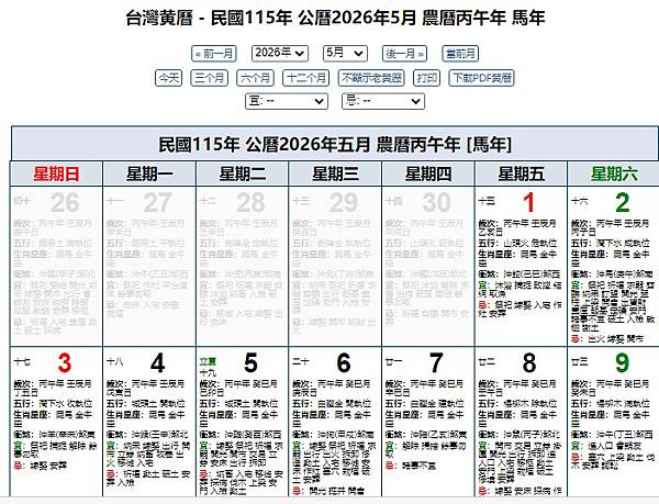 台灣黄曆 - 民國115年 公曆2026年5月 農曆丙午年 馬年