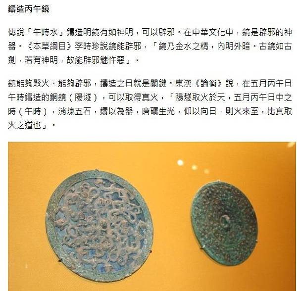 鏡能夠聚火、能夠辟邪,鑄造之日就是關鍵。東漢《論衡》說,在五月丙午日午時鑄造的銅鏡(陽燧),可以取得真火,「陽燧取火於天,五月丙午日中之時(午時),消煉五石,鑄以為器,磨礪生光,仰以向日,則火來至,比真取火之道也」。