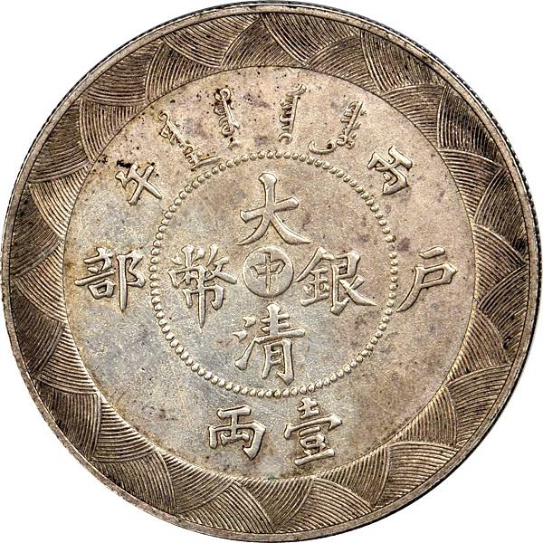 正面珠圈內為大清銀幣中心陰刻廠記中字,意即中央的造幣總廠所製。 上方四個滿文,兩旁丙午為干支紀年。 左右側之戶部為主管發行的機關名稱。 底部一兩為銀幣面值單位。 背面水龍的周圍珠圈環繞,外圈刻光緒年造中文及TAI-CHING-TI-KUO Silver Coin(大清帝國銀幣)英文。 代表帝王威權的蟠龍是背面設計的重點。 以半空中騰雲駕霧的方式呈現,令人敬畏。 扭曲似蛇的身軀自龍首後方向右後再旋轉左方,成為反S的形狀,十刺龍尾朝向右側。 圓形鱗片覆蓋龍身,附有火伽地及雲朵,龍腳五爪,表現出騰龍在天的地位,底部有水波紋,自古這圖案就是吉祥的象徵。 正中帶火焰的智慧之珠讓整體設計完成。 表面淡金琥珀色調包漿,令人讚賞。 評得此分的僅有這枚,PCGS統計中更高分的只有九枚