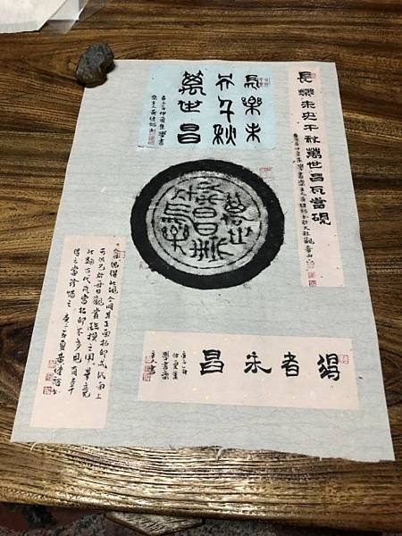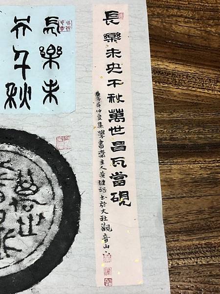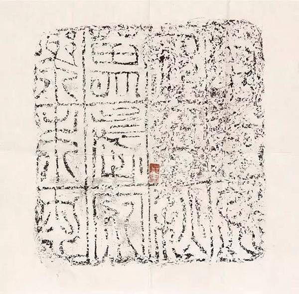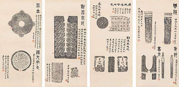 註:本件含吳大澂藏古物拓本四屏,皆由徐翰卿手拓,吳氏題名並作扼要考訂。愙齋常以己藏及友好所蓄古物,拓製組合,單軸四屏,朱砂墨拓,鼎彝陶玉,千變萬化,再長題攷訂,分贈仝道,壁懸几張,古香襲人。
