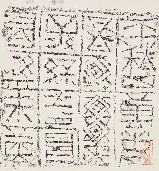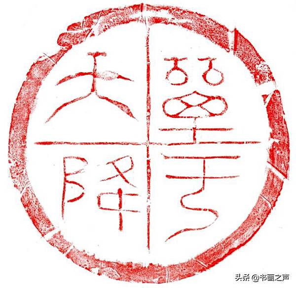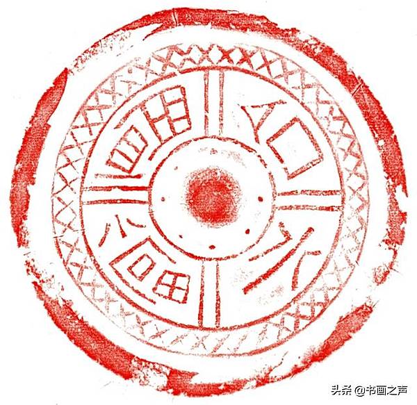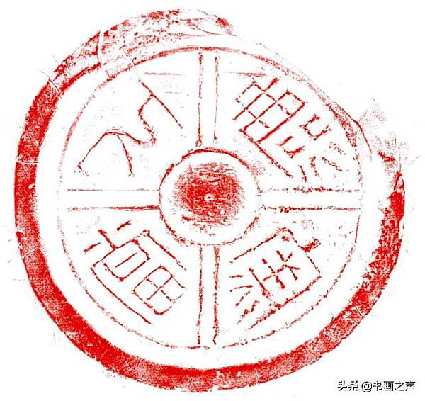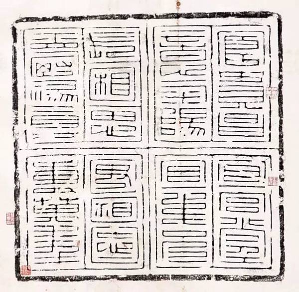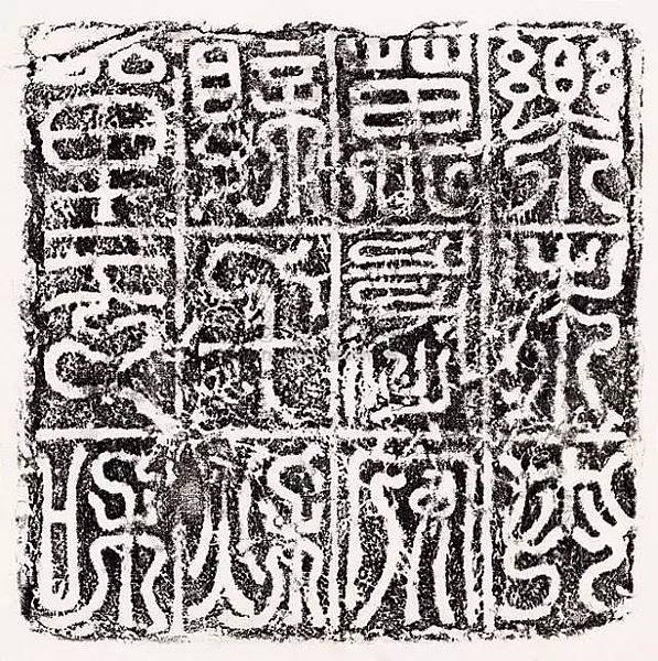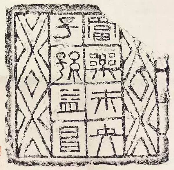「富貴昌,宜宮堂;意氣陽,宜弟兄;長相思,毋相忘;爵祿尊,壽萬年」,二十四字漢磚。 陽文繆篆,在正方的磚面中分成四格,橫豎線條以等距離排列,篆法方整,各字因勢又長短不一,空間協調而獨具匠心,被「甲骨文之父」王懿榮在四川新繁發現,廣為世人所知,當為漢代出土文字磚之王者。