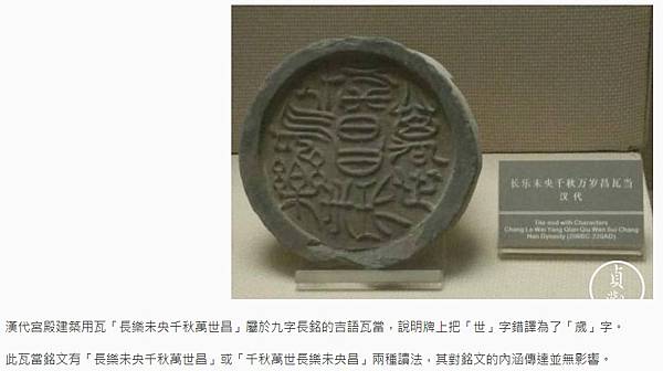 漢代宮殿建築用瓦「長樂未央千秋萬世昌」屬於九字長銘的吉語瓦當,說明牌上把「世」字錯譯為了「歲」字。