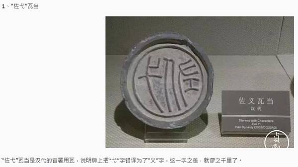 "佐弋"瓦當是漢代的官署用瓦,說明牌上把"弋"字錯譯為了"義"字,這一字之差,就謬之千里了。