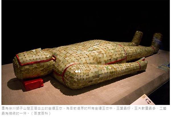 圖為徐州獅子山楚王陵出土的金縷玉衣,為目前復原的所有金縷玉衣中,玉質最好,玉片數量最多、工藝最為精緻的一件。(百度百科)