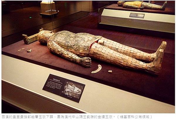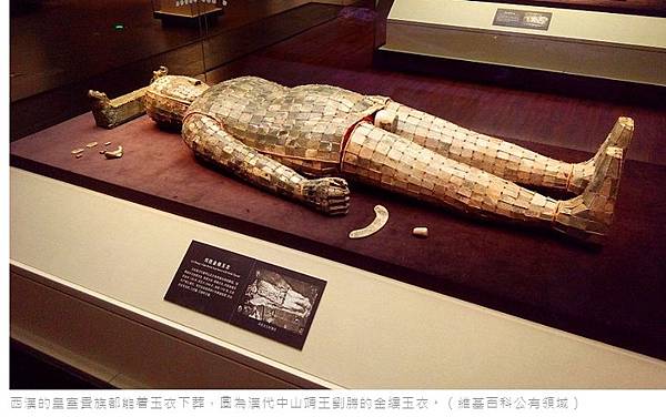 西漢的皇室貴族都能着玉衣下葬,圖為漢代中山靖王劉勝的金縷玉衣。(維基百科公有領域)