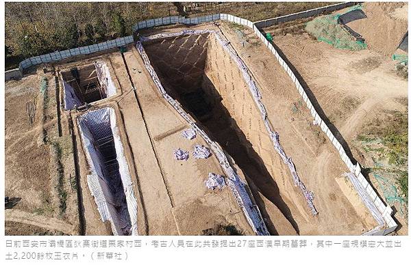 日前,陝西省西安市文物保護考古研究院,在西安市灞橋區狄寨街道栗家村西,共發掘出27座西漢早期墓葬,其中一座規模宏大並出土2,200餘枚玉衣片。西安市文物保護考古專家表示,這座墓室帶有「家丞」字樣的封泥、完整的伎樂陶俑、編鐘與編磬組合,顯示墓主身份應不低於侯級。西漢時期,列侯為王以下的最高爵位。而該墓出土的玉衣片數量,為目前已知漢代長安城周邊玉衣片最多的一座西漢墓,考古人員期待玉衣復原後可為漢代玉衣制度研究提供重要的資料。