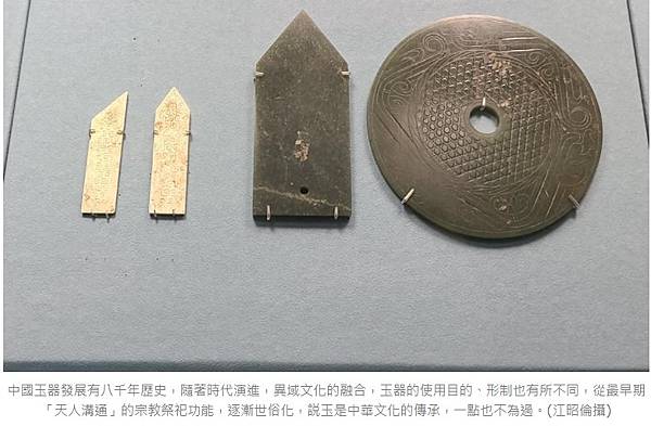 中國玉器發展有八千年歷史,隨著時代演進,異域文化的融合,玉器的使用目的、形制也有所不同,從最早期「天人溝通」的宗教祭祀功能,逐漸世俗化,説玉是中華文化的傳承,一點也不為過。(江昭倫攝)