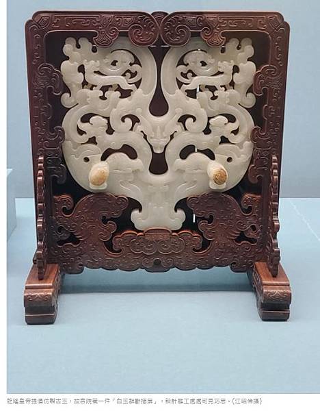 乾隆自己則因為愛好賞玩古玉,因此也提倡仿製古玉。故宮院藏一件「白玉群獸插屏」,有祥雲、有瑞獸、有神樹,明顯漢玉制式,正是乾隆仿古玉的代表,而實際上它是一個銅鏡台座,白玉本體下方左右突起的圓雕鳥雀造型,則是為了放置銅鏡之用,鳥雀局部還刻意染成棕褐色,以示其羽毛,呈現靈動感;看不見的木座背後,還設計了夾層,目的是為了收納銅鏡,可說巧思處處。