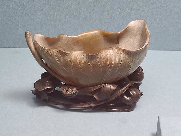 一件刻意染色的玉荷葉杯,葉緣彎曲起皺,代表當時雕刻技藝成熟細膩,也被認為傳達宋代文人惆悵不得志卻又不放棄理想的象徵意義。