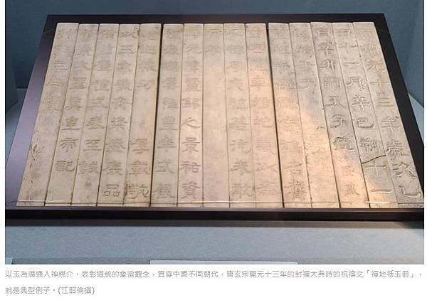 以玉為溝通人神媒介,表彰道統的象徵觀念,貫穿中國不同朝代,唐玄宗開元十三年的封禪大典時的祝禱文「禪地祗玉冊」,就是典型例子。(江昭倫攝)