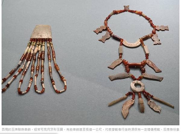 到了商周,玉器成為貴族階級身份或是統治者的象徵,像是西周的玉牌聯珠串飾,經常可見月牙形玉簧,有些串飾甚至長達一公尺,穿戴這樣的禮器,代表穿戴者行走時須保有一定禮儀規範,反應不凡的身份。