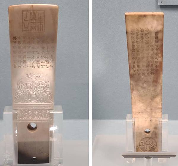 龍山時期的兩件玉圭,為文化部指定國寶,源自斧的造型,由於上頭有獸面紋、鷹鳥紋等紋樣,代表在當時龍山人心目中具有神聖地位。