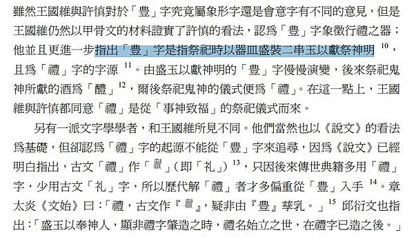 甲骨文用「豊」來表示「禮」的含義。《說文解字》:「豊,行禮之器也。從豆,象形。」這顯然是「禮」從「豊」字添加「礻(示)」部分化出來之後,「豊」的含義縮小。許慎沒告訴我們「豊」的上半部分是什麼。我們看「豊」字的甲骨文就會明白很多。甲骨文上部「山」形器之中兩側有「玉」,說明古人行禮需要用到特定的玉器,將盛了玉的豆作為祭品。
