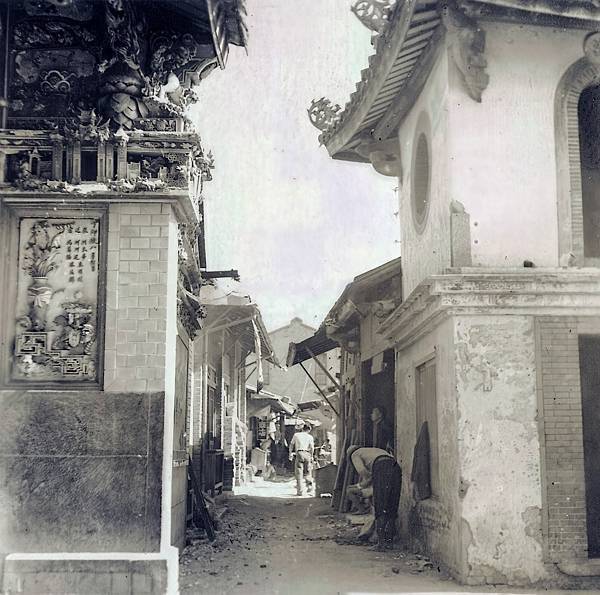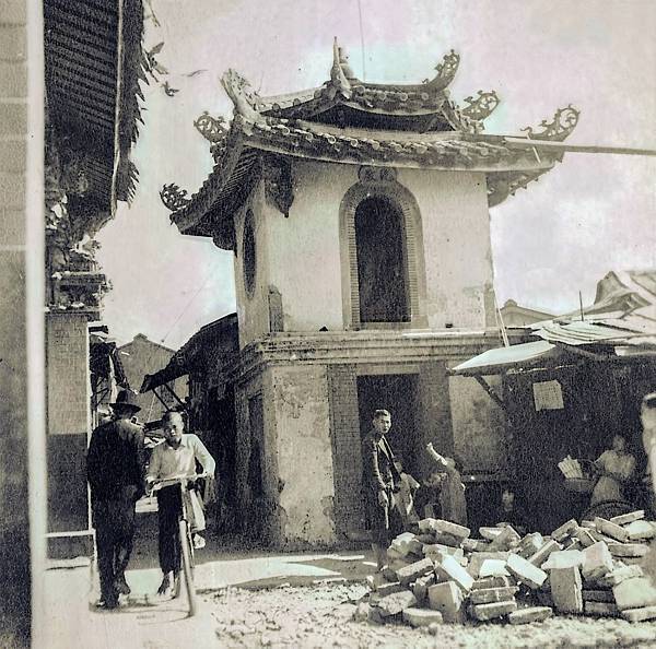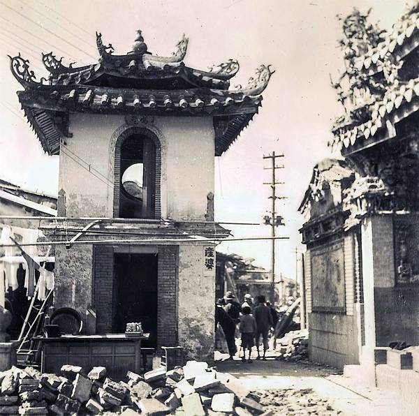 松山虔三拍攝1940臺南嶽帝廟前鐘鼓樓拆除前景象