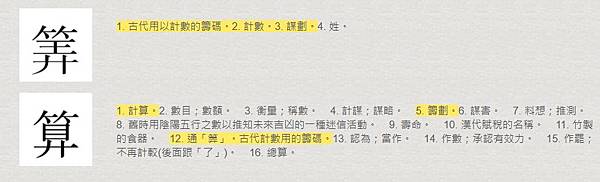 1 古代用來計數的器具。漢.王充《論衡.感虛》:「夫以筯撞鐘,以筭擊鼓,不能鳴者,所用撞擊之者小也。」南朝宋.劉義慶《世說新語.文學》:「如籌筭,雖無情,運之者有情。」