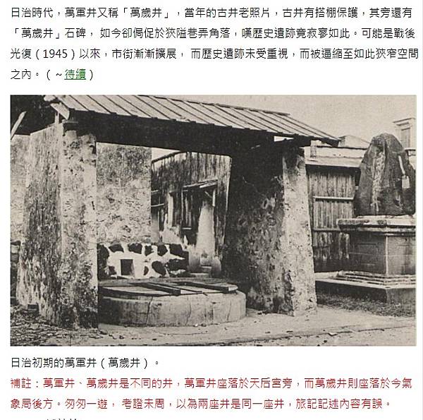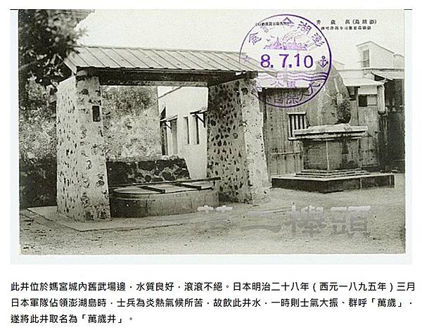 萬歲井為明治28年(1895)3月比志島混成枝隊登陸澎湖所開鑿之井,圍牆與頂蓋係大正以後所增築。今日萬歲井頂蓋已無蹤影,兩側圍牆尚存,然周遭環境髒亂不堪,萬歲井紀念碑則渺然無存。萬歲井 https://bit.ly/3pESw5D