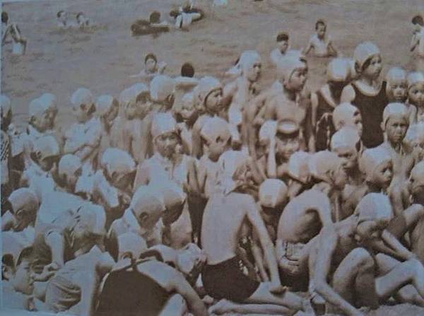 #民國 42 年起,每年暑假前十天下午,由老師率領五年級學生至大沙灣海水浴場 ( 現今東岸貨櫃碼頭 ) 實施游泳教學 ~ 圖片取自仁愛國小創校百年專輯