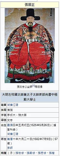 張居正(1525年5月26日-1582年7月9日),字叔大,號太嶽,又稱張江陵,湖廣江陵縣(今湖北江陵縣)人,祖籍直隸鳳陽縣,明代政治家、改革家,萬曆年間,官至太師、吏部尚書兼中極殿大學士,為內閣首輔長達十年。知人善任,重用名將李成梁、戚繼光等,鎮守北部邊防,為改革營造穩定的外部環境;任用潘季馴治理黃河,卓有成效。任內推行一條鞭法與考成法,改革賦稅與官吏考核制度,影響深遠。