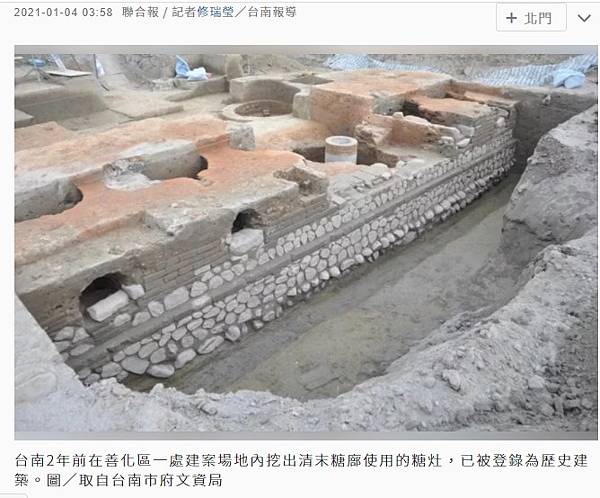 台南2年前在善化區一處建案場地內挖出清末糖廍使用的糖灶,已被登錄為歷史建築。