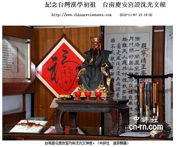 中評社台南11月7日電(記者 趙家麟)緬懷台灣漢學文獻初祖沈光文,台南善化慶安宮內設有“沈光文紀念館”,館內介紹沈光文渡海來的歷史源流考據,還有神尊、相關的文獻,以及後人的紀念文章。