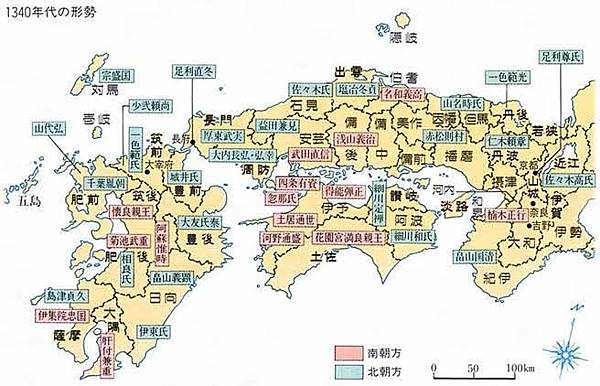 說到日本的南北朝,我們首先可能會被字面上的意思給誤導了,以為日本的南北朝與中國的南北朝一樣,就是存在著兩個或兩個以上,以南方與北方相互對立的政權。這點放在中國的南北朝自是沒有問題,然而在日本的南北朝則很有問題。這是因為日本的南北朝事實上只是以南朝與北朝首都(吉野、平安京)兩者的相對位置來稱呼的,與其勢力分布是沒有相關的。南朝與北朝在地理分布上從東日本到西日本,都是以犬牙交錯的方式存在著。當然,不可諱言的,南朝的統治核心還是以南海道(今和歌山與四國)為主,但同時南朝勢力也在西海道(九州)與東國地區有不少的支持者,其中又以在九州活動的懷良親王最為知名。
