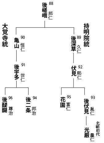 後深草和龜山兩個皇統,各自以所有的莊園為名而稱為「持明院統」和「大覺寺統」。簡單來講就是皇室裡的血統派系。持明院統當然不服這種弟弟凌駕哥哥的現狀,於是向當時的幕府求援。在幕府施壓下,大覺寺統被迫和持明院統達成各自推出人選擔任天皇10年的協定。