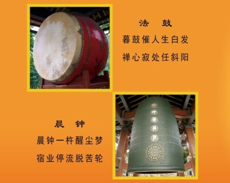 晨鐘暮鼓是寺院中僧眾作息的號令.行者聞鐘鼓聲,要發如是願:勤修戒定慧,息滅貪嗔痴.