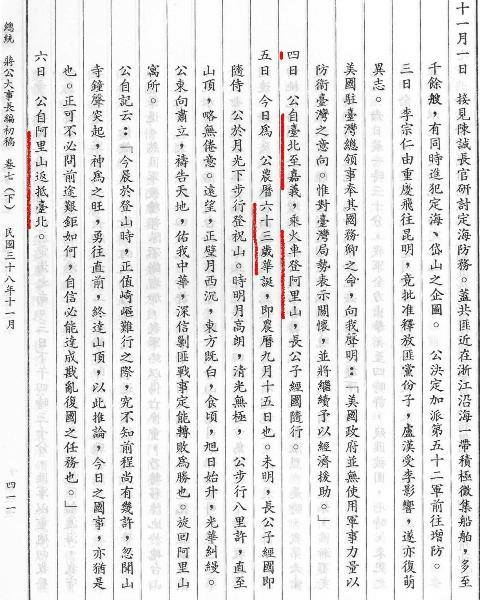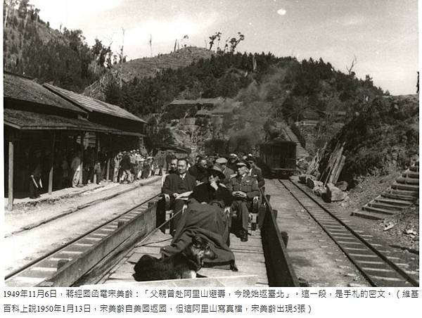 1949年11月6日,蔣經國函電宋美齡:「父親曾赴阿里山避壽,今晚始返臺北」。這一段,是手札的密文。(維基百科上說1950年1月13日,宋美齡自美國返國,但這阿里山寫真檔,宋美齡出現5張)