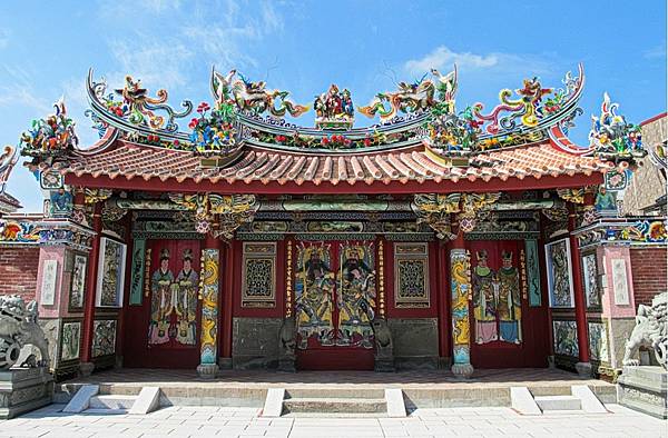 垂脊上之「牌頭」有忠孝節義故事之剪黏,簷下龍柱之「龍身」及「人物帶騎」部分做彩繪,「柱身」則未施,柱頭並做「蓮花瓣」及多面體之裝飾。文化資產網 > 文化資產 > 古蹟 https://bit.ly/39vqnrx